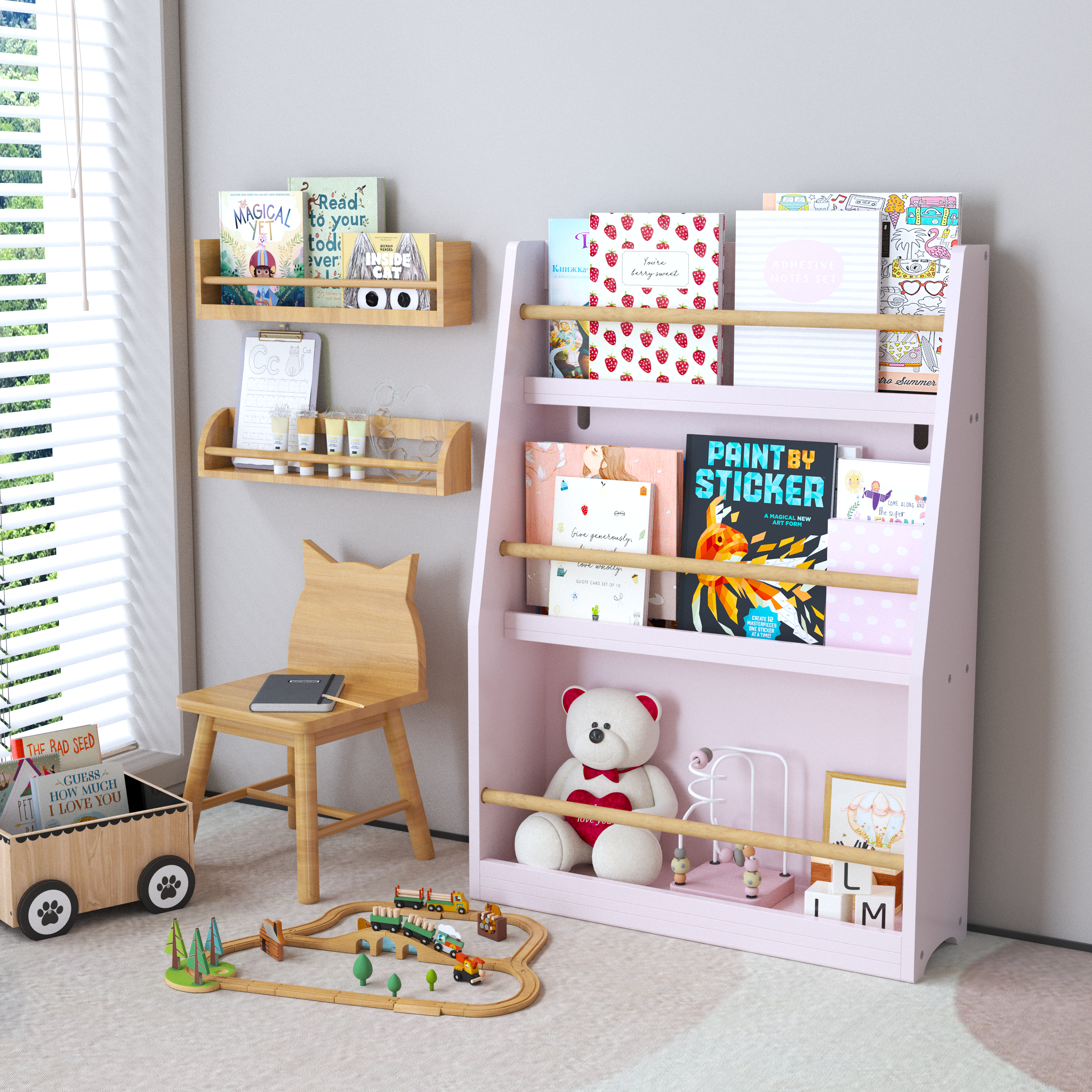 Designed for little readers aged 3 and up, this bookshelf places books within easy reach, encouraging independent selection, return, and daily organizational habits.