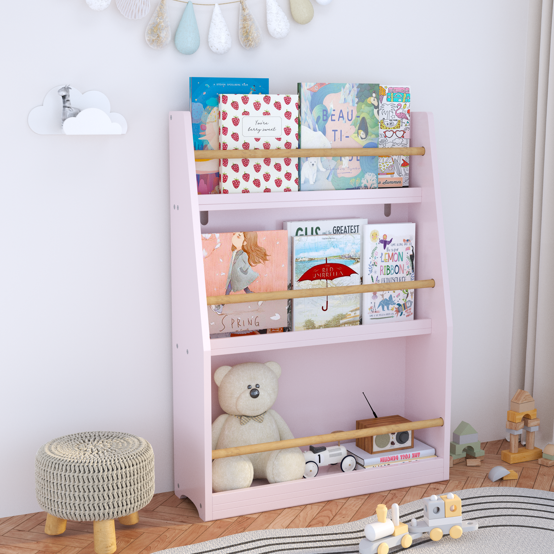3 Tier Kids Book Shelf in a playful pink finish creates an inviting reading corner while helping to keep bedrooms, playrooms, and classrooms organized.