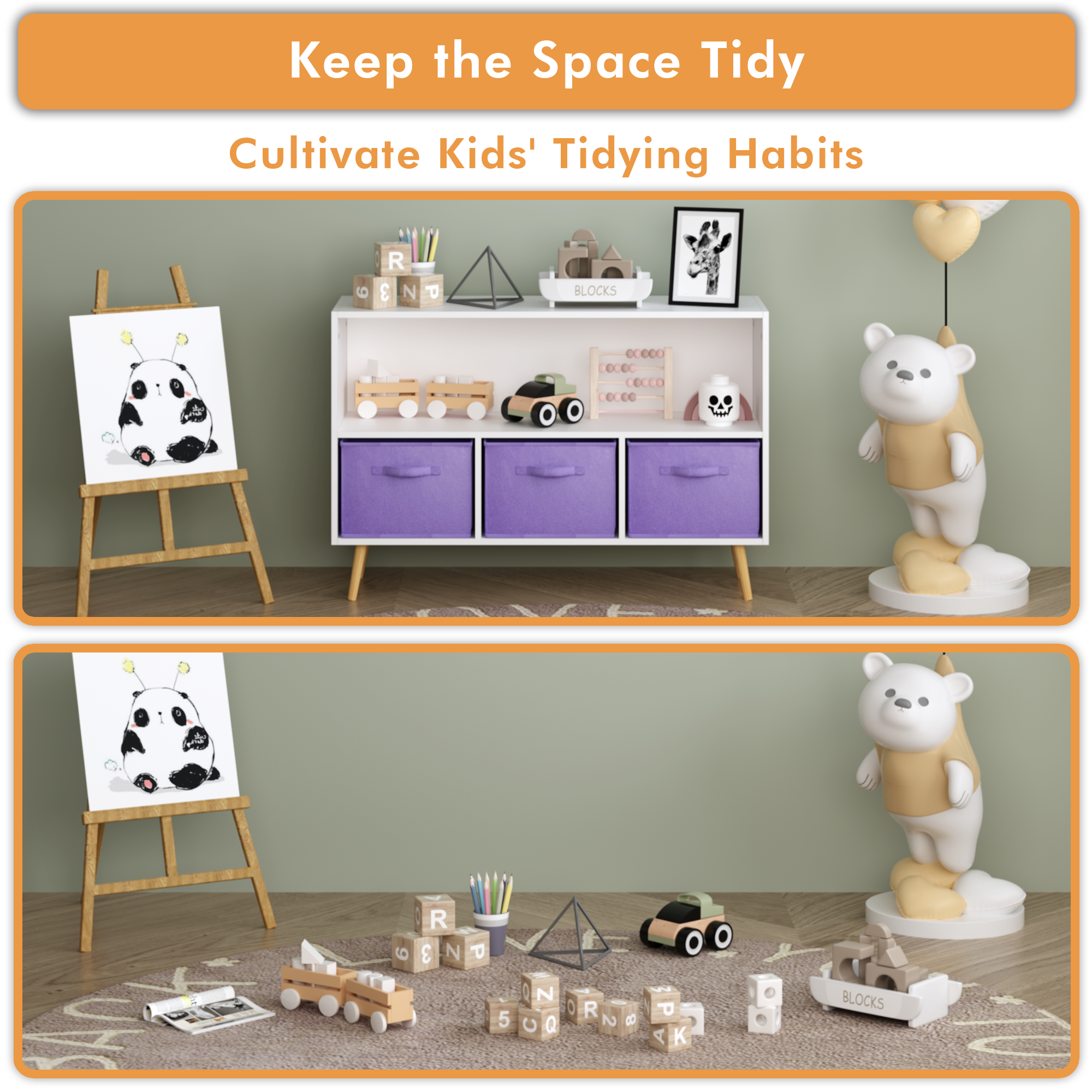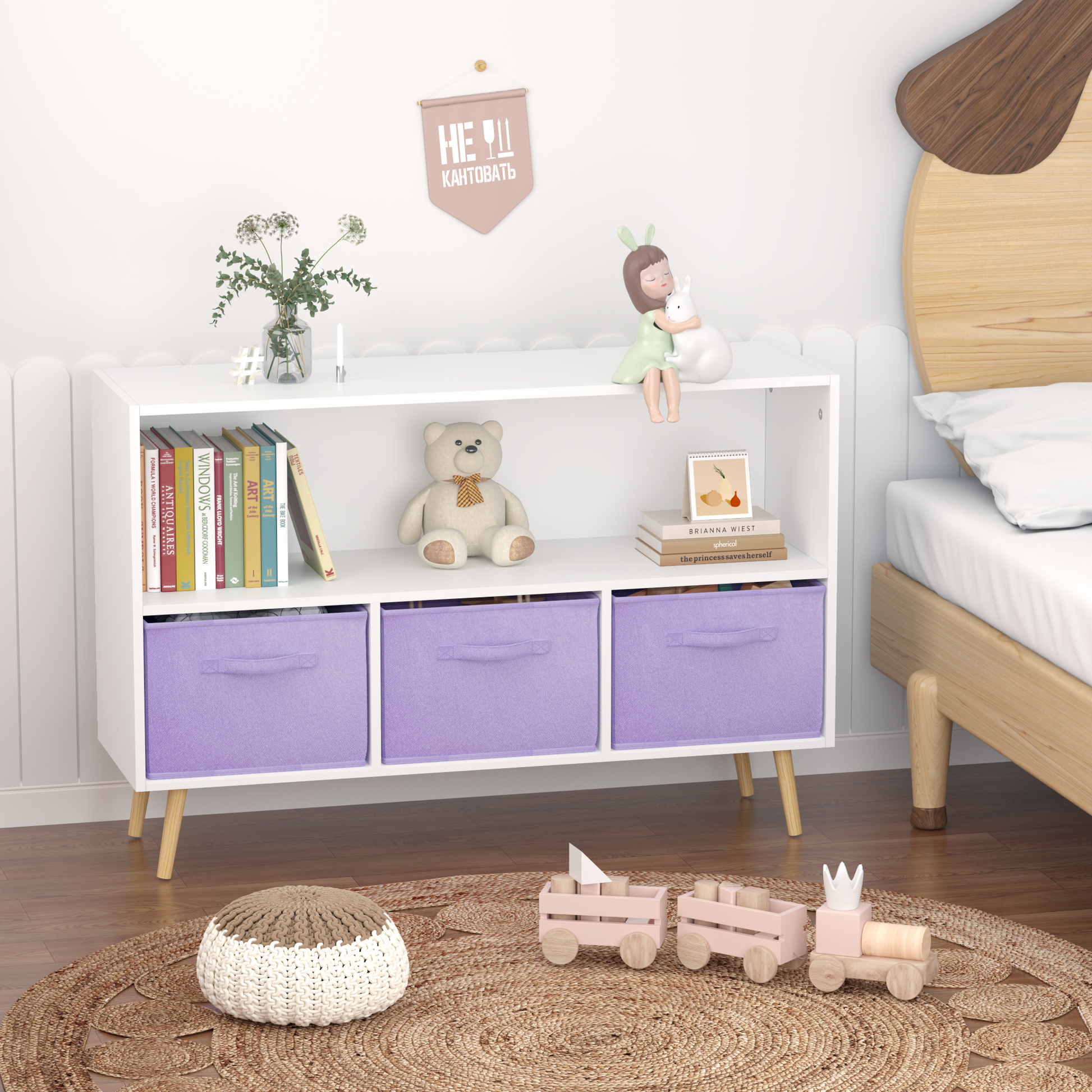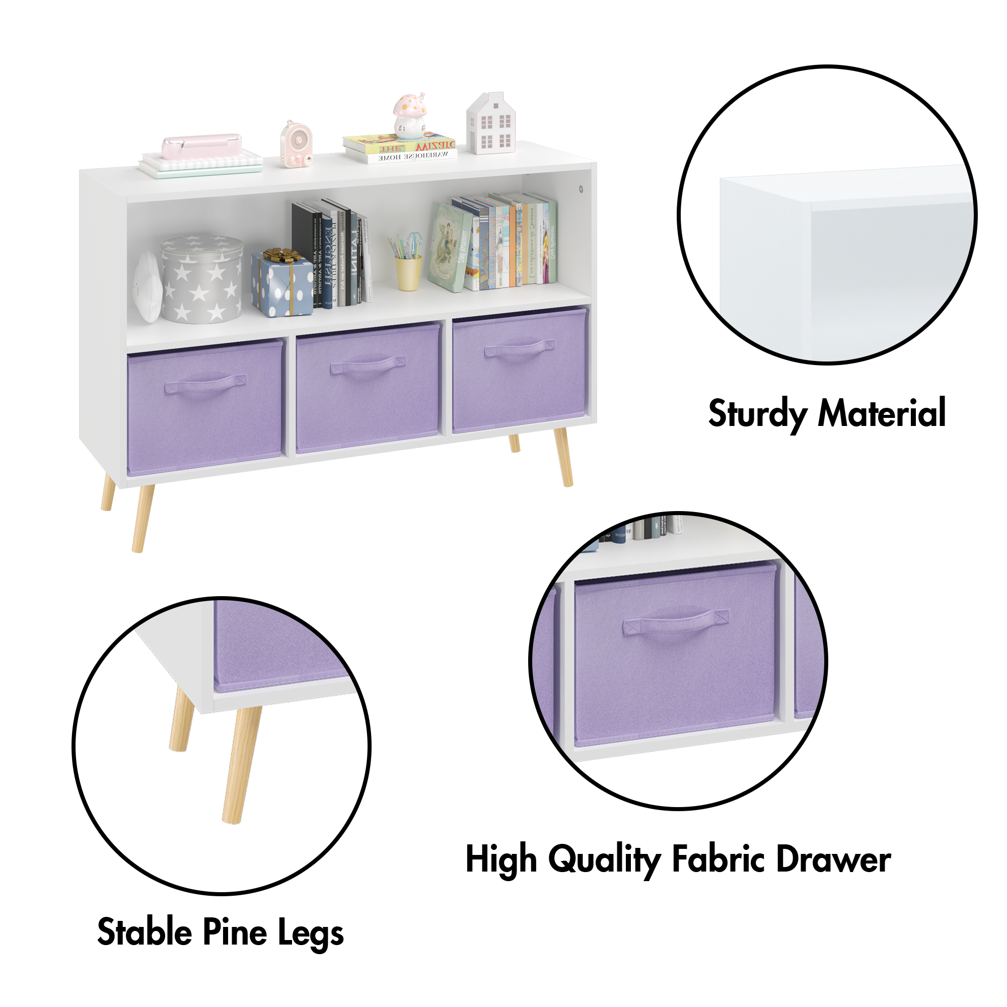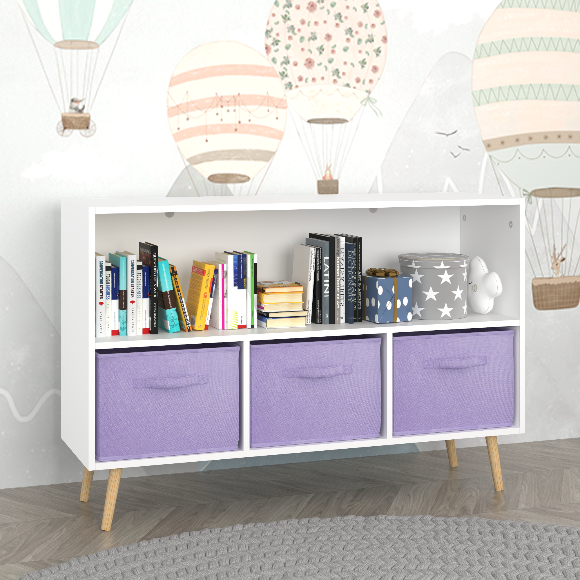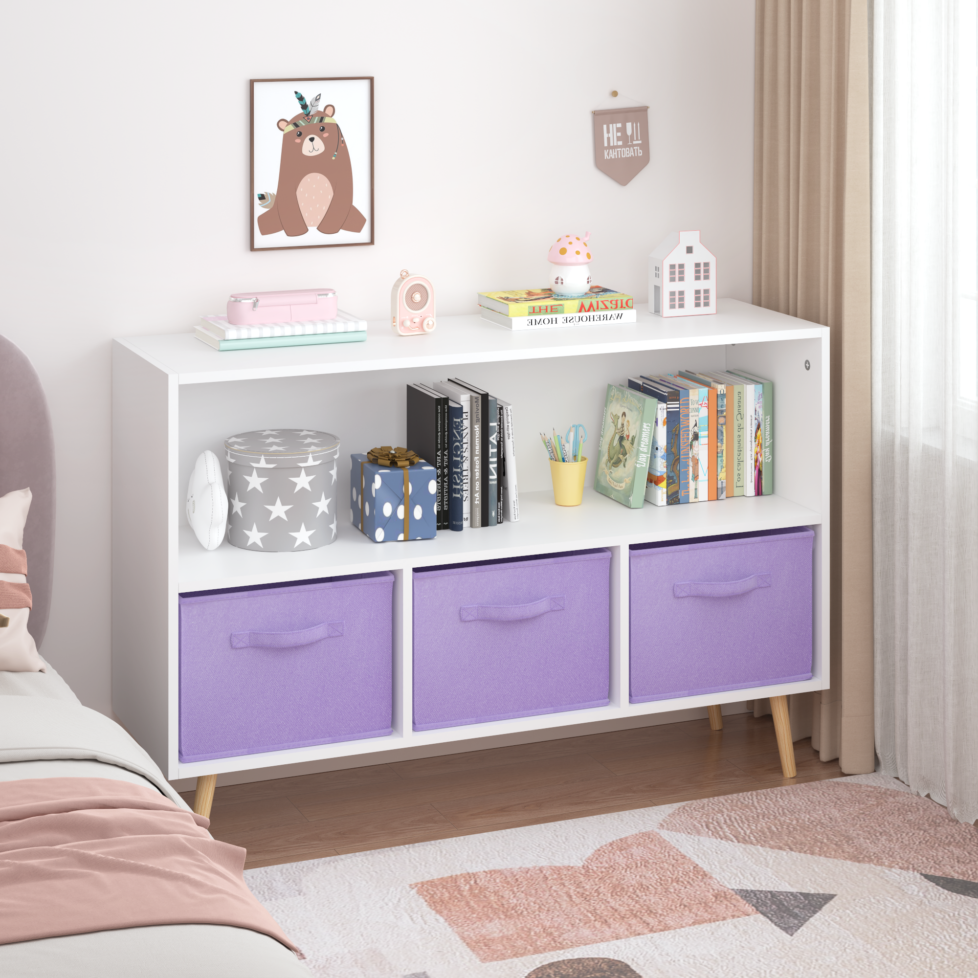 Kids Bookcase With Collapsible Fabric Drawers, Children's Book Display, Toy Storage Cabinet Organizer, White Purple
